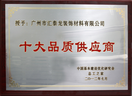 2012年7月,由中國基本建設(shè)優(yōu)化研究會、中國房地產(chǎn)總工之家聯(lián)合組織的“中國十大品質(zhì)供應(yīng)商”的評比活動結(jié)果揭曉,匯泰龍公司榮膺“十大品質(zhì)供應(yīng)商”稱號,并獲得證書和獎牌。這是匯泰龍公司再一次榮獲全國性的獎項,標(biāo)志著企業(yè)品牌進(jìn)一步得到行業(yè)及消費者的充分認(rèn)可。