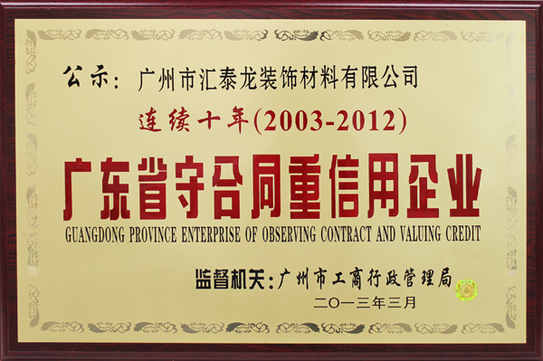 匯泰龍公司自成立以來,嚴格遵守《中華人民共和國合同法》和公司關(guān)于合同管理的相關(guān)規(guī)定、強化合同管理機制、加強公司合同信用建設(shè)。經(jīng)過十七年的發(fā)展,匯泰龍人深刻理解“人無信不立,企無信不興”這一信條,并以“品質(zhì)造就滿意”作為經(jīng)營理念深深的把“誠信”植根于每一個匯泰龍人的心中,把“誠信”貫徹到日常工作的方方面面?!皬V東省守合同重信用企業(yè)”榮譽稱號是誠信企業(yè)的金字招牌,是對企業(yè)信用的最權(quán)威評定。誠信是企業(yè)發(fā)展的興業(yè)之本,更是企業(yè)塑造品牌的立足之本。匯泰龍把“守合同重信用”作為打造成社會誠信的標榜,積極做好誠信體系建設(shè),為打造“誠信廣州”和促進中國裝飾材料行業(yè)市場又好又快發(fā)展做出新的更大的貢獻。